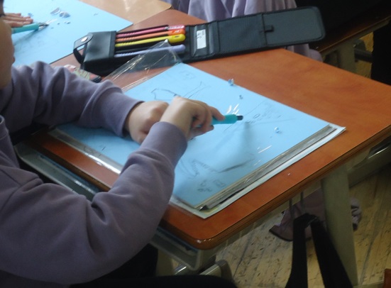 4年生は初めての彫刻刀に挑戦しています。下絵を反転して写しとった木版を、彫刻刀で彫り進めていきます。三角刀や丸刀など彫刻刀の特徴から効果的な彫り方を考えなくてはいけないので、慎重に彫り進めていました。